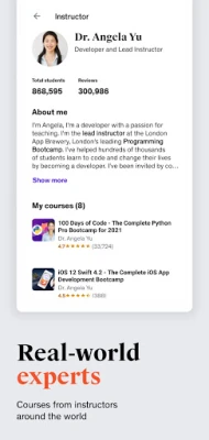 Udemy के साथ, आप प्रौद्योगिकी और व्यवसाय से लेकर रचनात्मक सोच और व्यक्तिगत विकास तक, विभिन्न विषयों में वास्तविक दुनिया के विशेषज्ञों से सीख सकते हैं। एआई-संचालित सिफारिशों, लचीले प्रारूपों और आपकी दैनिक कार्यप्रणाली में आसानी से फिट होने वाले साधनों के साथ, Udemy निरंतर विकास को आपके जीवन का एक सहज हिस्सा बनाने में मदद करता है।